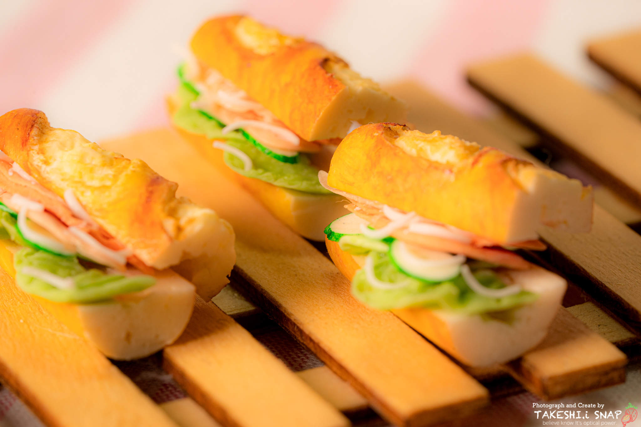 樹脂粘土で作るミニチュアフード57号のスモークサーモンサンドですが、イマイチスィーツデコ感はありませんが、ミニチュアフードと言うことで。意外と鮭を作るのが手間だったりします。
